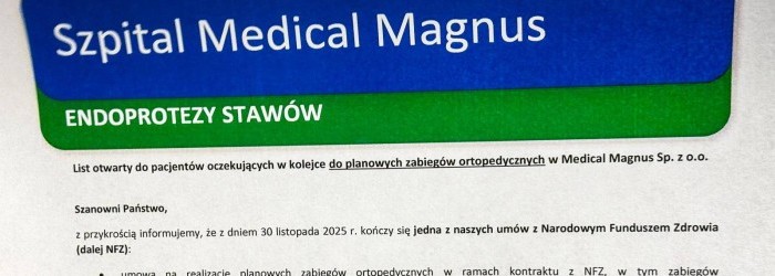 List otwarty do pacjentów oczekujących w kolejce do planowych zabiegów ortopedycznych w Medical Magnus Sp. z o.o. Szanowni Państwo, z przykrością informujemy, że z dniem 30 listopada 2025 r. kończy się jedna z naszych umów z Narodowym Funduszem Zdrowia (dalej NFZ): umowa na realizację planowych zabiegów ortopedycznych w ramach kontraktu z NFZ, w tym zabiegów endoprotezoplastyki stawów biodrowych i stawów kolanowych. Mimo podjętych przez nasz zespół starań i bardzo[...]